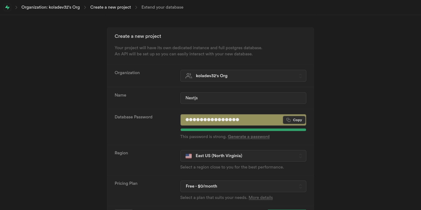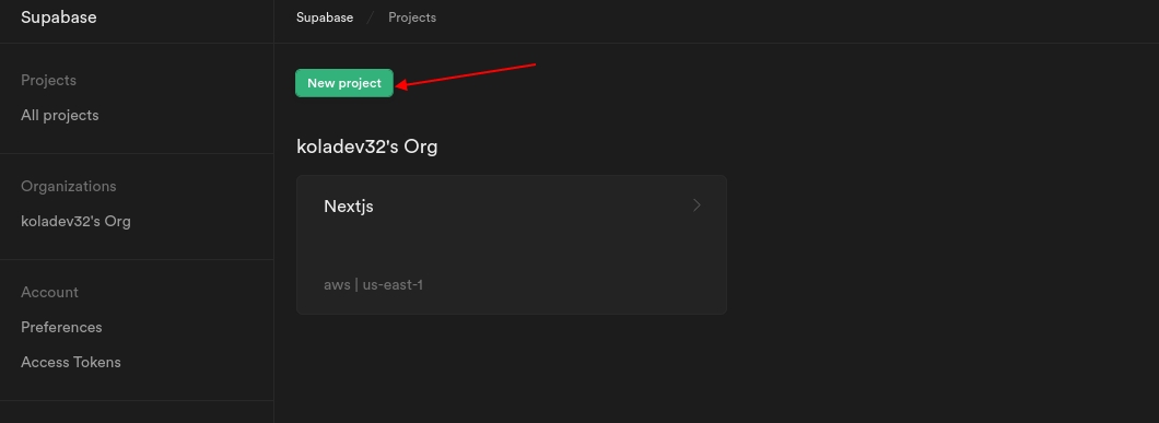Make sure to have an account created at Supabase. When the account is created and verified, you can create a new project.