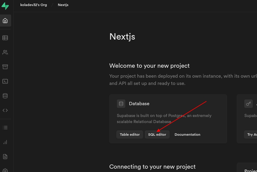 After that, you will have access to options on the Dashboard. We need to create a new table and insert data. We will do this directly in the SQL editor.