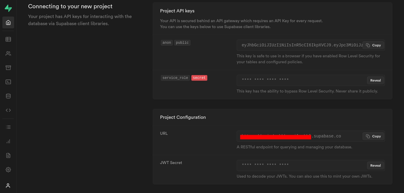 NEXT_PUBLIC_SUPABASE_ANON_KEY=YOUR_SUPABASE_ANON_KEYYou can find the keys on the project page.